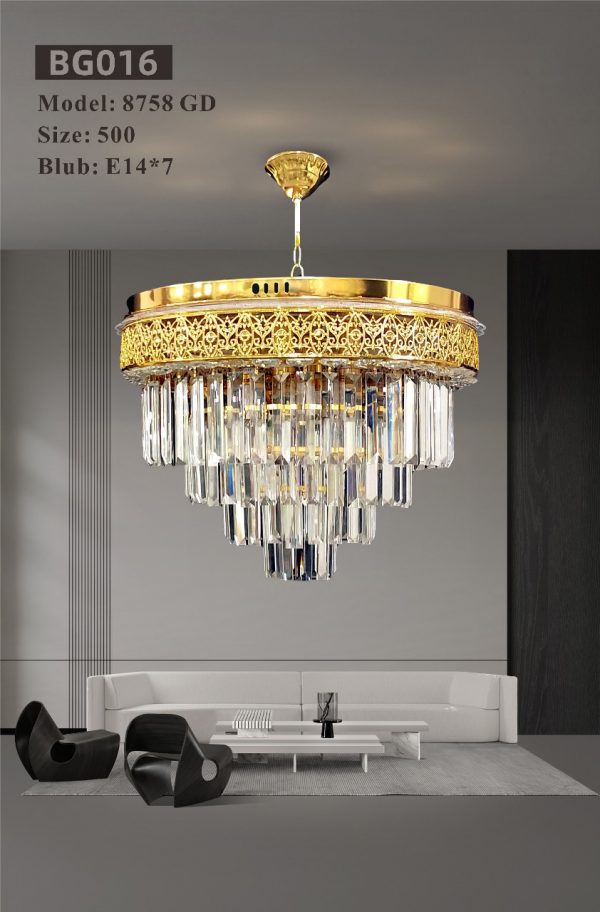 Bring sophistication to your space with the BG016 chandelier. Designed with a sleek golden finish and shimmering crystal details, this 500 mm fixture delivers elegance and radiant illumination perfect for dining rooms, lounges, or modern living spaces.