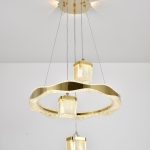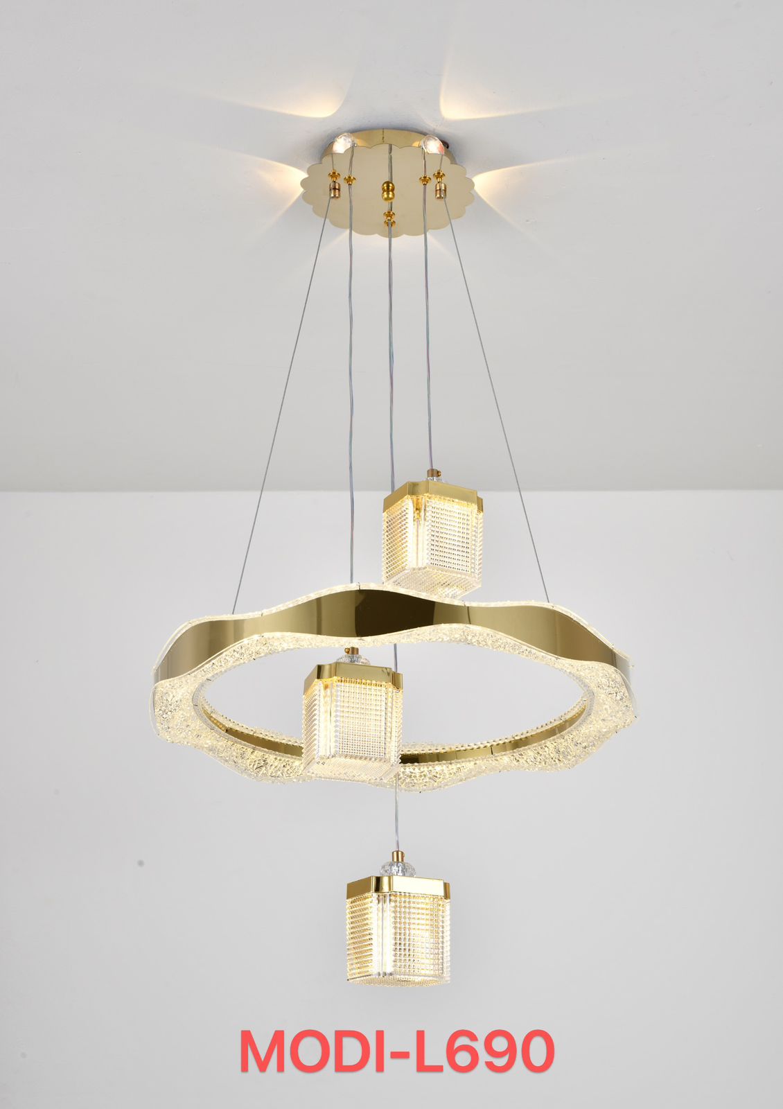 Illuminate your space with the L690 Modern LED Chandelier. This striking fixture is a perfect blend of contemporary design and elegant sparkle. It features a unique, undulating black and white wave LED light structure that creates a dynamic focal point. Suspended below are four exquisite globular shades with a textured, crystalline glass body and a luxurious gold-tone metal cap. Each globe is finished with a sparkling crystal drop, adding a touch of classic glamour.